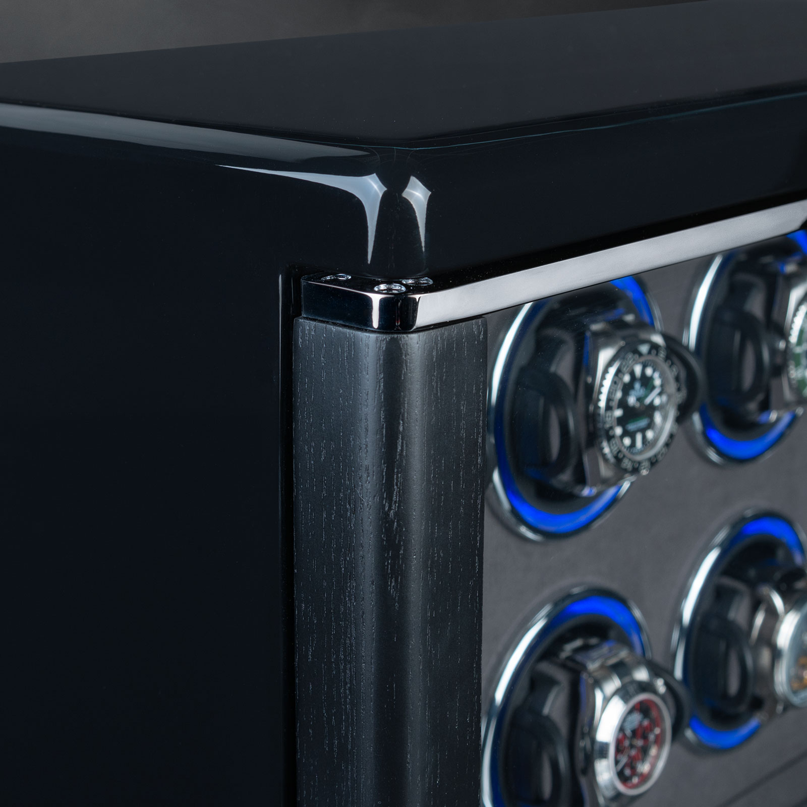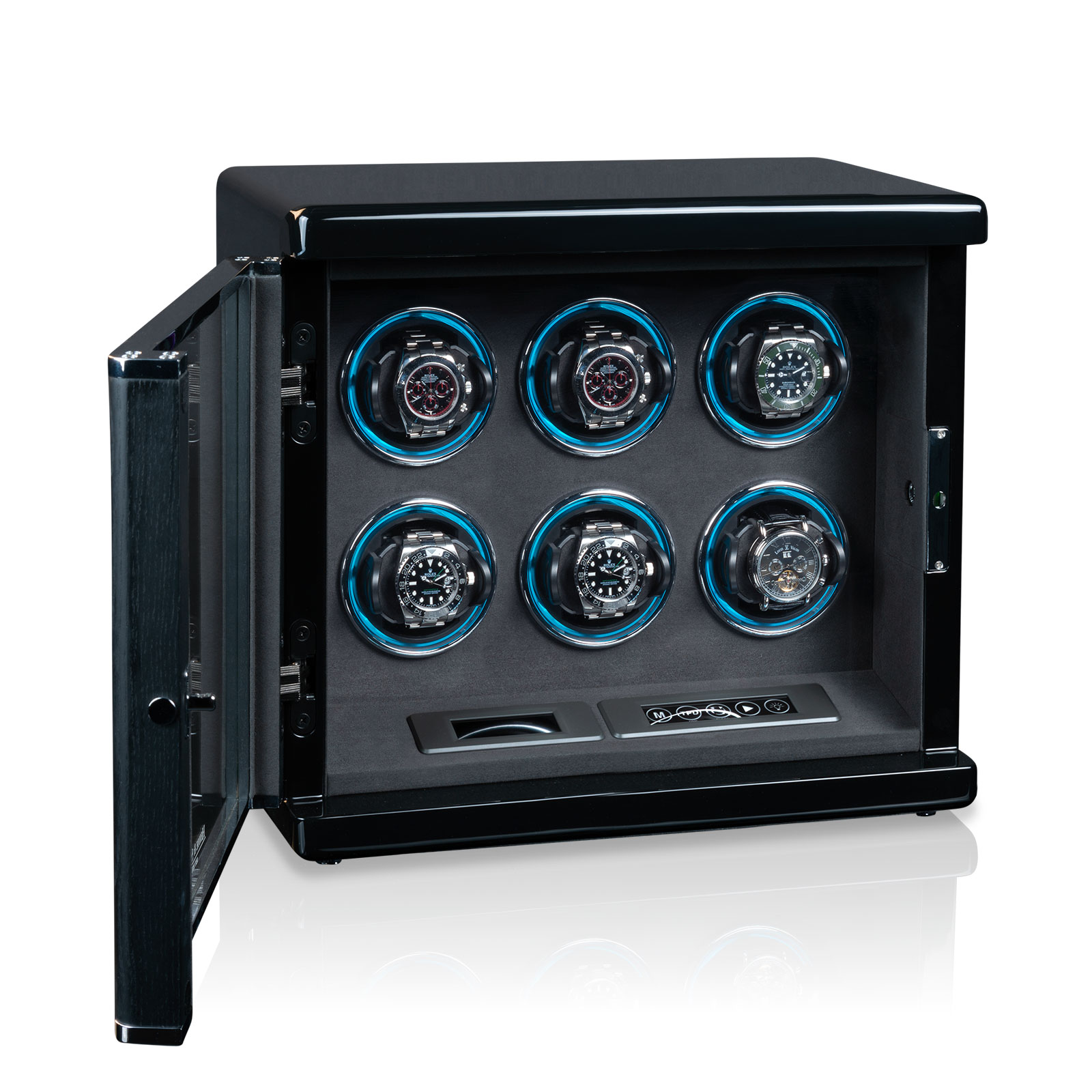 Die zur Seite öffnende Glasfront schützt Ihre wertvollen Uhren nicht nur vor unbefugtem Zugriff, sondern auch vor Staub und Schmutz.
