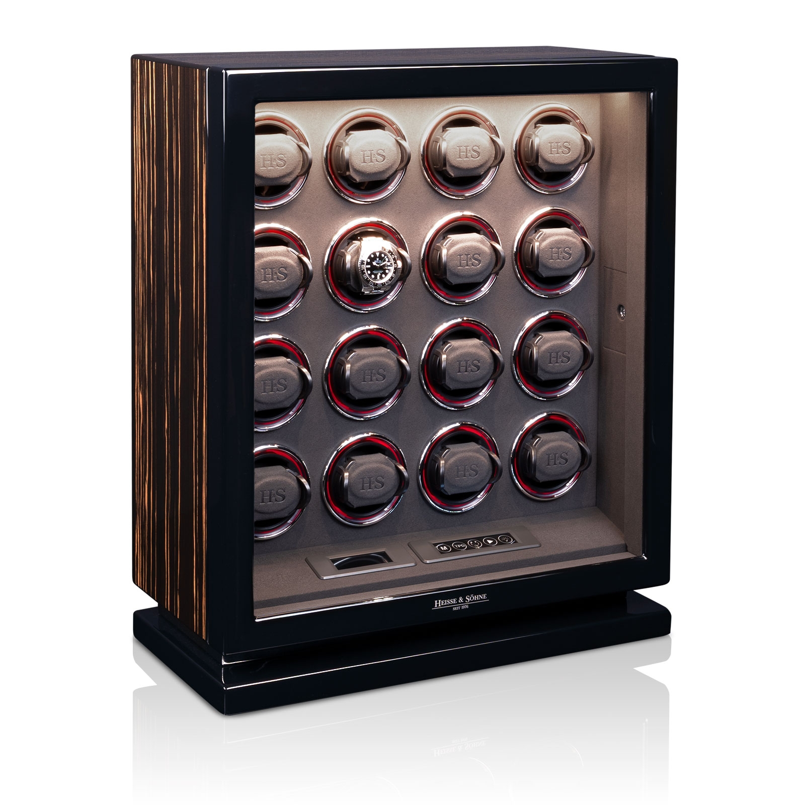 Die neueste H&S Premium-Drive Technologie von Heisse & Söhne garantiert einen sanften, leisen und dauerhaften Aufzug Ihrer Uhren. Die einzeln programmierbaren, fünffach kugelgelagerten Module ermöglichen einen mühelosen Aufzug auch von schweren Uhren. Das moderne H&S LCD-Control unterstützt eine intuitive Programmierung der Umdrehungszahlen pro Tag (450-1500 / 8 Stufen) sowie der Rotationsrichtung (rechts, links und alternierend), um den individuellen Anforderungen jeder Uhr gerecht zu werden.